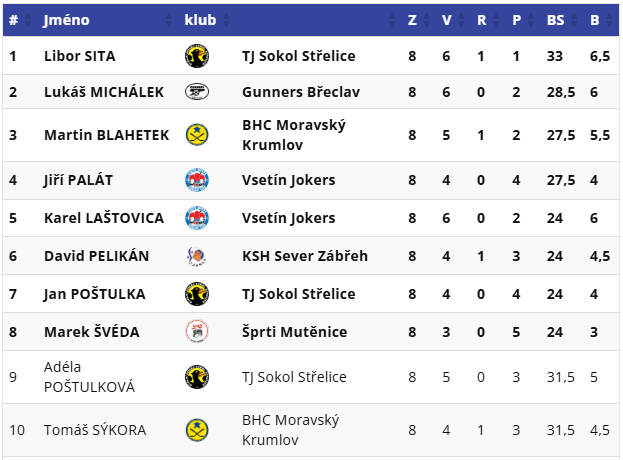 této kategorie se letos účastnilo 30 hráčů, z nichž opět 8 postupuje na MČR. A i v této kategorii máme svého zástupce. Tomáš Syky Sýkora. Minulý rok skončil Syky třetí. Dnes pomýšlel na metu nejvyšší. A až poslední zápas rozhodl, že letos stane těsně pod vrcholem. Se skvělou bilancí 4-1-2 se vyhoupl na stříbrný piedestal. Veliká gratulace, i když u něho převládal dnes smutek. Za pár dní mu ale dojde, že to nebyl vůbec špatný výsledek.