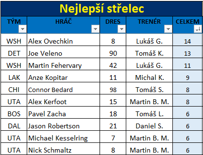 Tady se vrátíme k Washingtonu. Jak již bylo naznačeno výše, Ovechkin si dnes vzal střeleckou hokejku. Na jeho první trefu odpověděl Toews (COL). Dokonce O´Connor (COL) dokázal v první třetině ještě stav otočit na 2:1 pro Laviny. Jenže ve druhé a pak hlavně ve třetí třetině už Ovechkin zase řádil. Ve druhé srovnal na průběžných 2:2. Ve třetí třetině pak přidal třetí, čtvrtý, pátý, šestý a sedmý gól. Na konečných 8:2 upravil slovenský útočník Martin Fehervary.